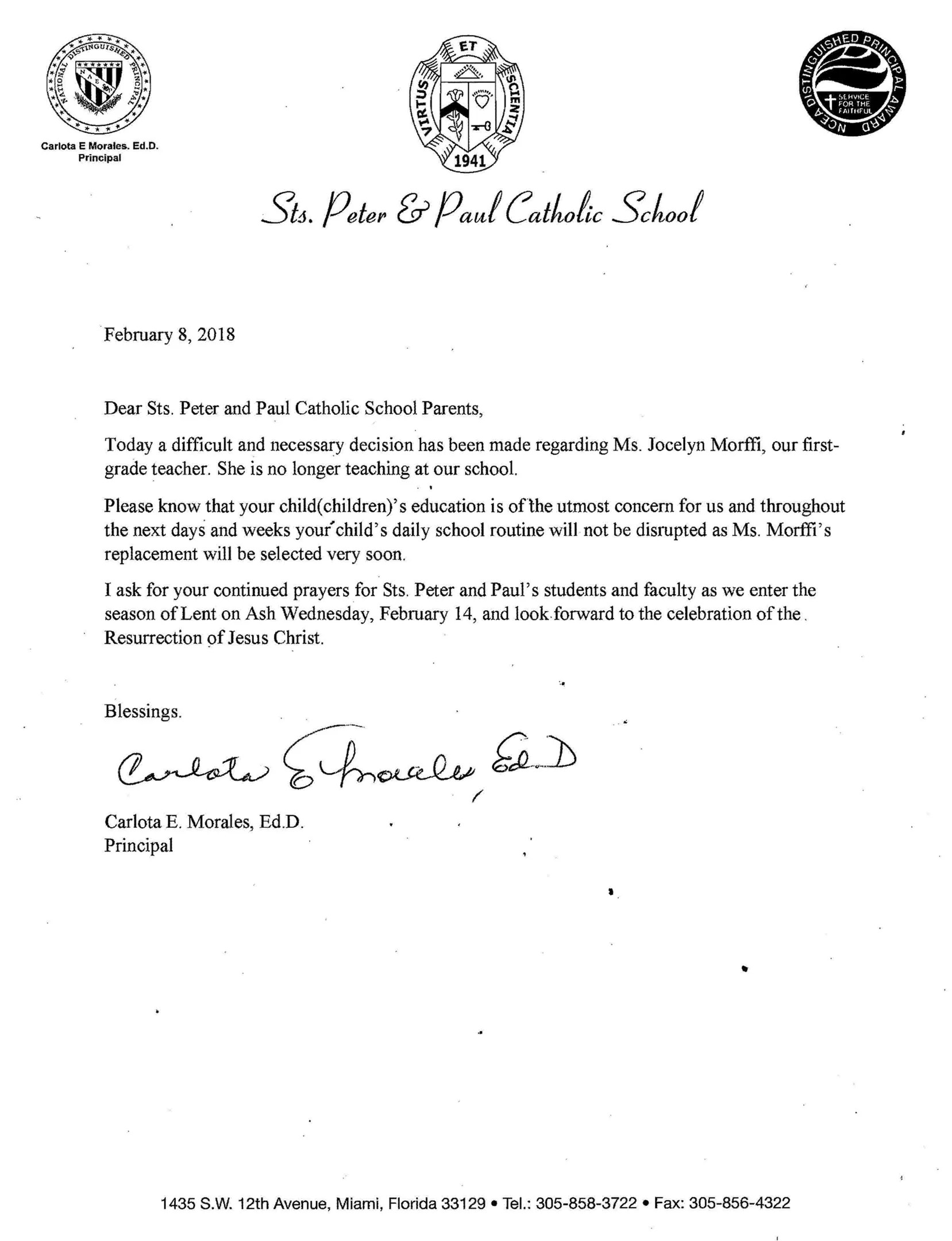 “Today a difficult and necessary decision has been made regarding Ms. Jocelyn Morffi, our first-grade teacher,” the letter reads. “She is no longer teaching at our school.”