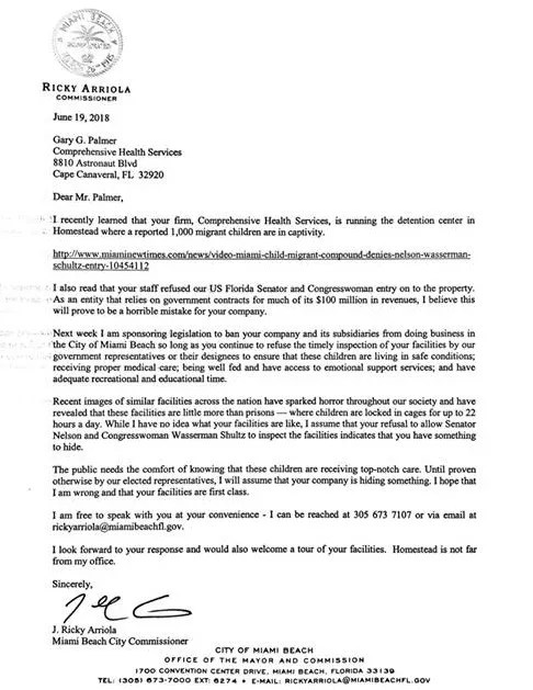 This Saturday, civil rights groups plan to march to the facility in protest. Now Arriola is mounting his own protest. In his letter, he told Comprehensive Health he was sponsoring legislation at the city level to ban the company from doing business in Miami Beach as long as politicians and inspectors are also banned from visiting the shelter. Arriola told New Times yesterday evening he had not yet