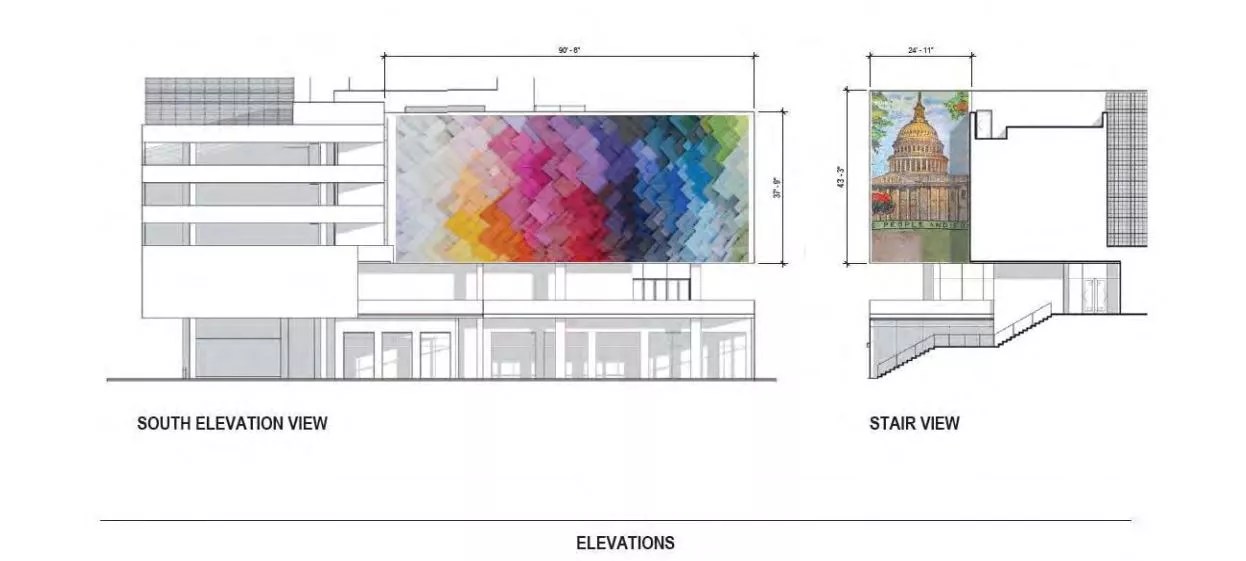 In an analysis of the proposal, Design Review Board members wrote that they generally had no objections to the installation of large LED screens, which they called “artistic super graphics,” especially when they “activate otherwise blank, featureless walls.” But they recommend the application be continued to a future meeting so it can be reviewed further.