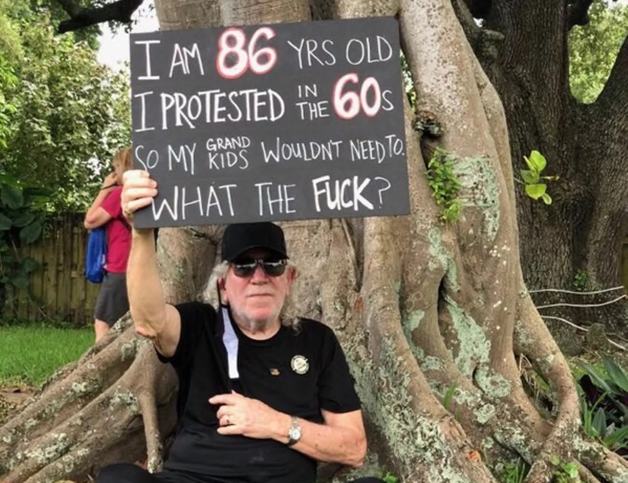 As the protests grew larger in the weeks after Floyd’s death, Abramson wanted to march somewhere he could be distanced from others. He and Hunt found a vigil in Miami Shores earlier this month with a smaller crowd than the protests in downtown Miami. He held up his sign, which read: “I am 86 years old. I protested in the 60s so my grandkids wouldn’t need to. What the fuck?”