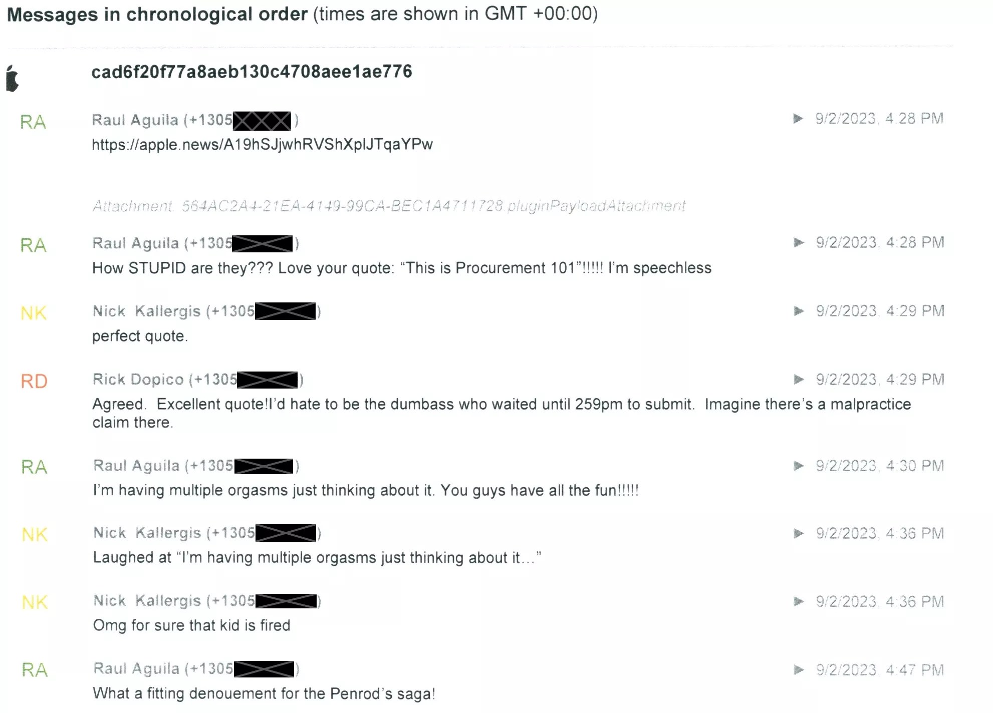 On September 2, 2023 – a day after city officials rejected Nikki Beach’s bid – former city attorney and interim city manager Raul Aguila dropped a link to a Herald story headlined, “City rejects Nikki Beach bid to remain in South Beach due to missed proposal deadline” in a group chat with chief deputy city attorney Nicholas Kallergis and current city attorney Ricardo Dopico.