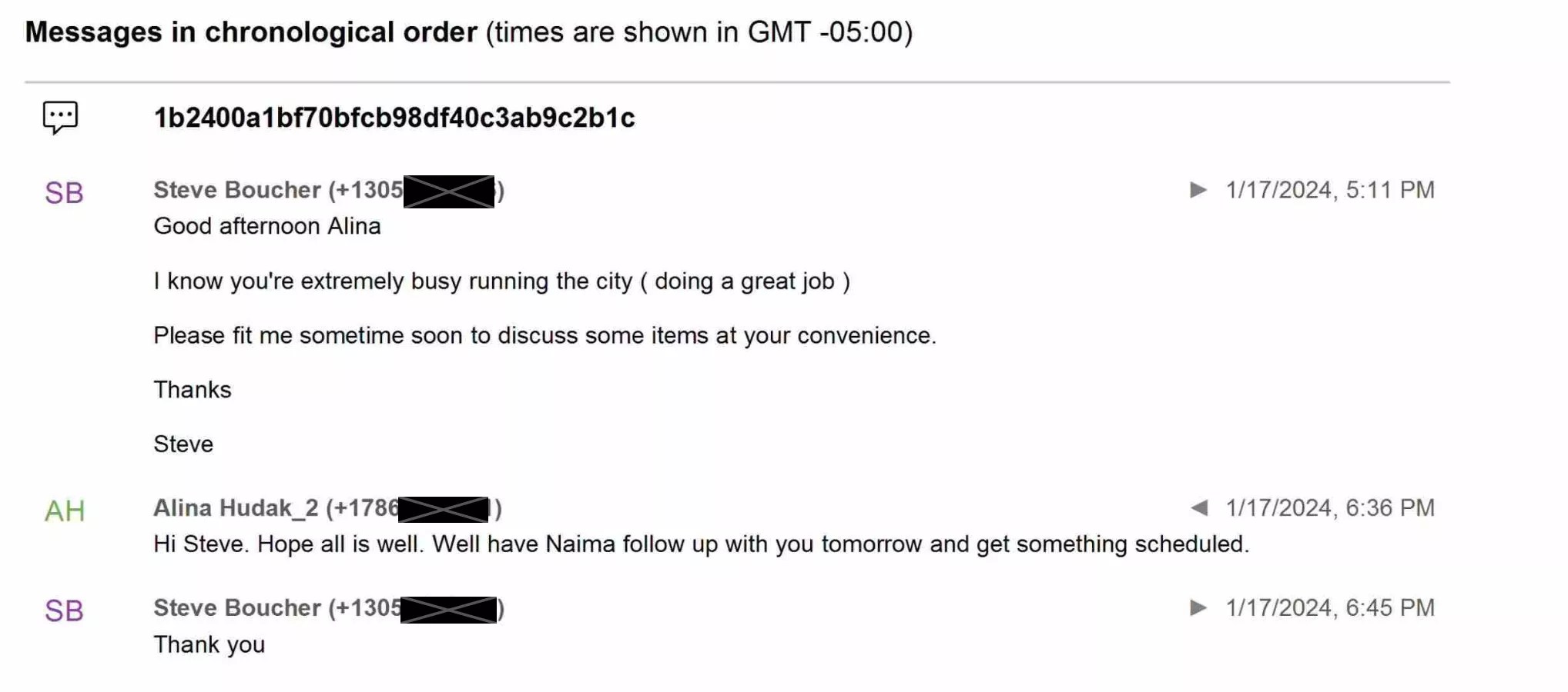 Steve Boucher texts then-City Manager Alina Hudak to set up a time “to discuss some items.”