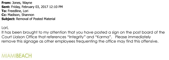 “Integrity is a powerful word used within the Police Department and City of Miami Beach, and I am shocked Major Jones feels it is an offensive word and that any City employee would take offense to any signage referring to integrity,” she wrote.