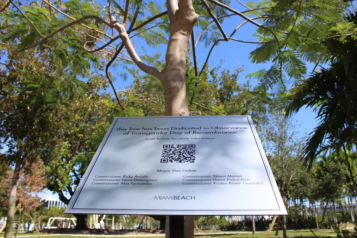 The city also unveiled a memorial plaque that capped off the November 2022 dedication of a tree to Trans Day of Remembrance, located at the northwest corner of Pride Park on Meridian Avenue and 19th Street. The dedication was established in partnership with local organizations TransSocial and The McKenzie Project alongside Miami-Dade County Commissioner Eileen Higgins, Miami Beach Commissioners David Richardson and Alex Fernandez, and Miami Beach Mayor Dan Gelber.