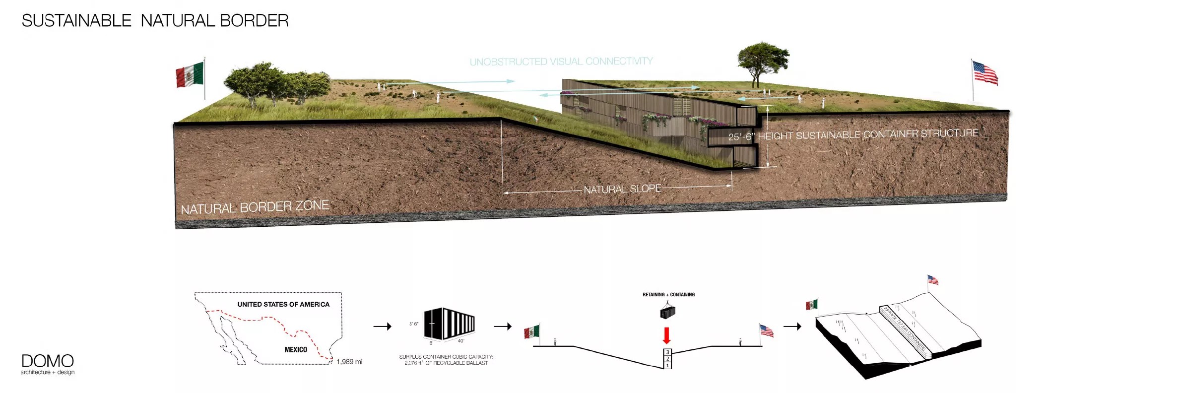 So, as some sort of publicity stunt, the Miami Beach-based Domo has pitched a remarkably misguided design for the wall made from über-hip shipping containers and recycled content.