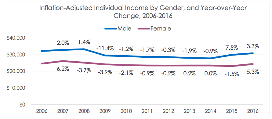 In 2016, female full-time workers in Miami-Dade had median yearly earnings of $31,671, compared to male median earnings of $37,323. Dollar for dollar, that means women garnered just 85 cents for every dollar a man made. (It’s worth adding that Miami-Dade incomes for both genders were significantly less than the national medians that year of $41,554 for women and $51,640 for men.)