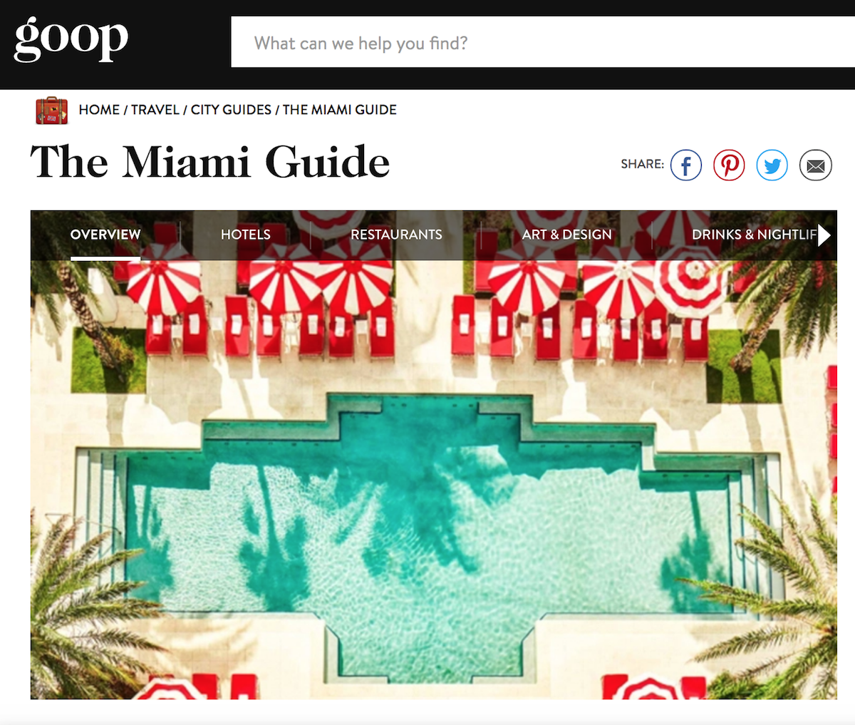 We’re going to focus instead on Goop’s “The Miami Guide,” published on its lifestyle blog in 2018 for discerning Goopers who want a subtropical getaway. It’s extensive – a whopping 128 blurbs dedicated to which hotels to stay in, restaurants to eat at, galleries and museums to visit, shops to spend at, health and wellness clubs to sweat in, and drinks and nightlife venues to frequent.
