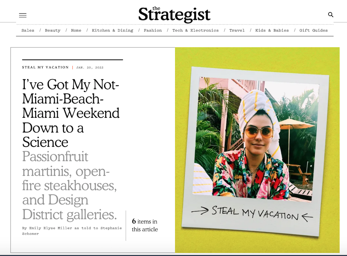 She goes on to recommend a number of brunch and shopping spots, including the Lincoln Road Mall (which boasts, what, an H&M and a Zara?), while making sure to call Miami Beach “Miami” almost without fail.