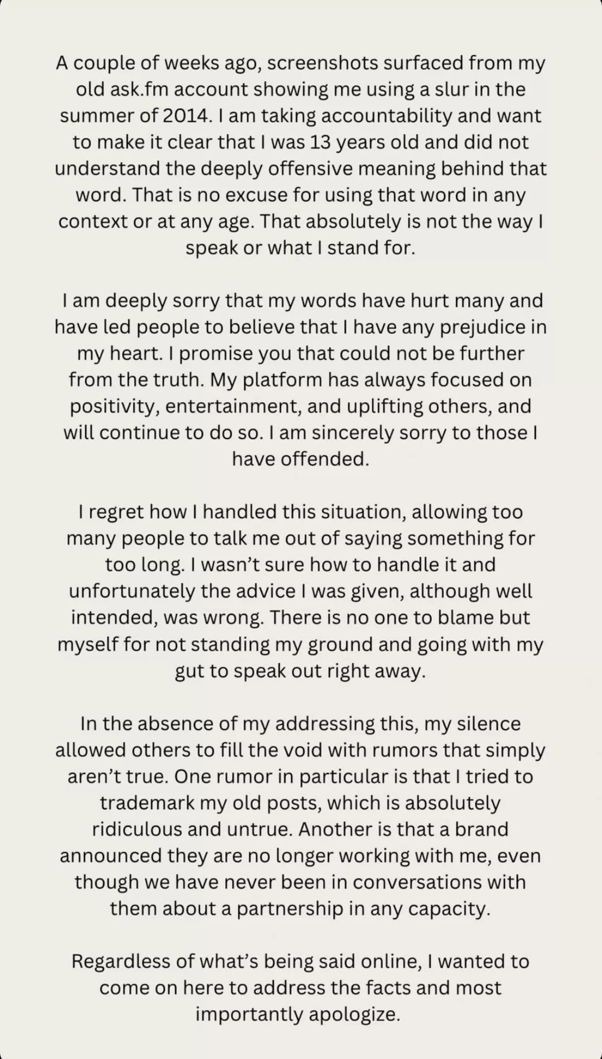 And further down: “Regardless of what’s being said online, I wanted to come on here to address the facts and most importantly apologize.”