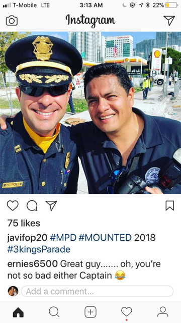 Under Miami Police Department rules, cops aren’t allowed to post selfies on Instagram showing them grinning next to detained, handcuffed people. The rule might seem self-evident, but in January, New Times caught Miami Police Captain Javier Ortiz – the city’s former police union chief known for insulting dead children, harassing citizens online, and bragging about his long list of use-of-force complaints – taking photos of himself smiling next to suspects in handcuffs and posting those selfies on his Instagram account, JaviFOP20. Bizarrely, he was also wearing someone else’s police name tag on his uniform in a different shot.