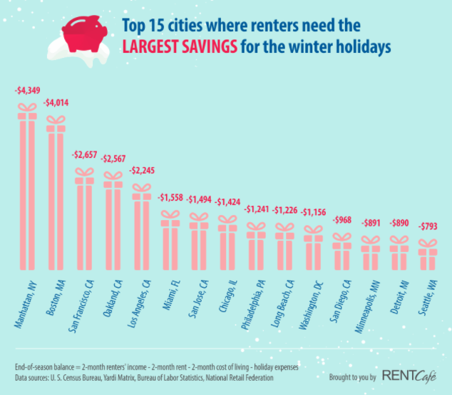 “With the holiday season in full swing, tenants deal with not only paying the rent, but with buying gifts, decorations, and festive dinners as well,” the analysts wrote. “For renters, these extra holiday costs are a problematic addition to their monthly budget, as they typically have lower incomes than homeowners.”