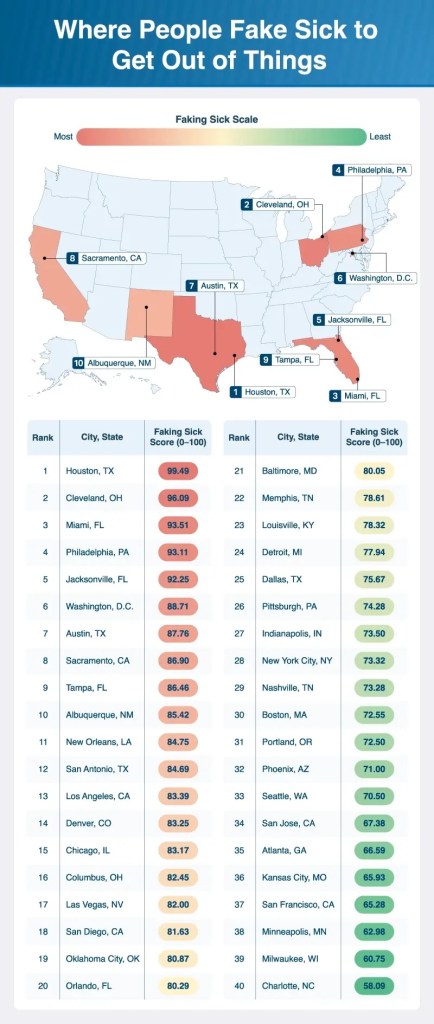 Surveyors posed questions to residents in the 40 largest cities in the U.S. Questions included whether residents have pretended to be sick to avoid plans, how often they’ve done so, what activities they’ve done this for, why they faked being sick, and more.