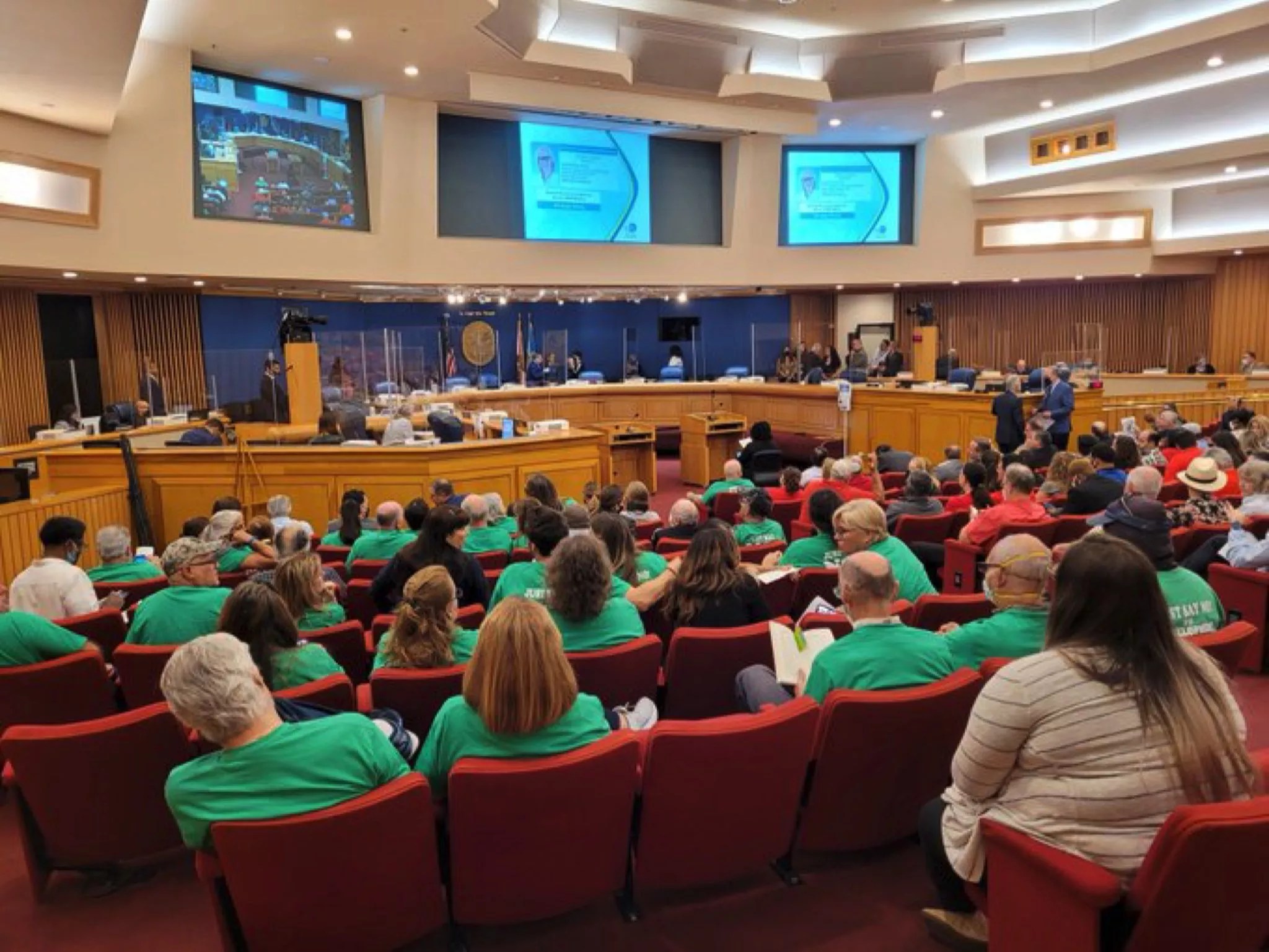 Residents opposed to the development attended Wednesday’s zoning hearing in a sea of matching “Save Calusa” green shirts.