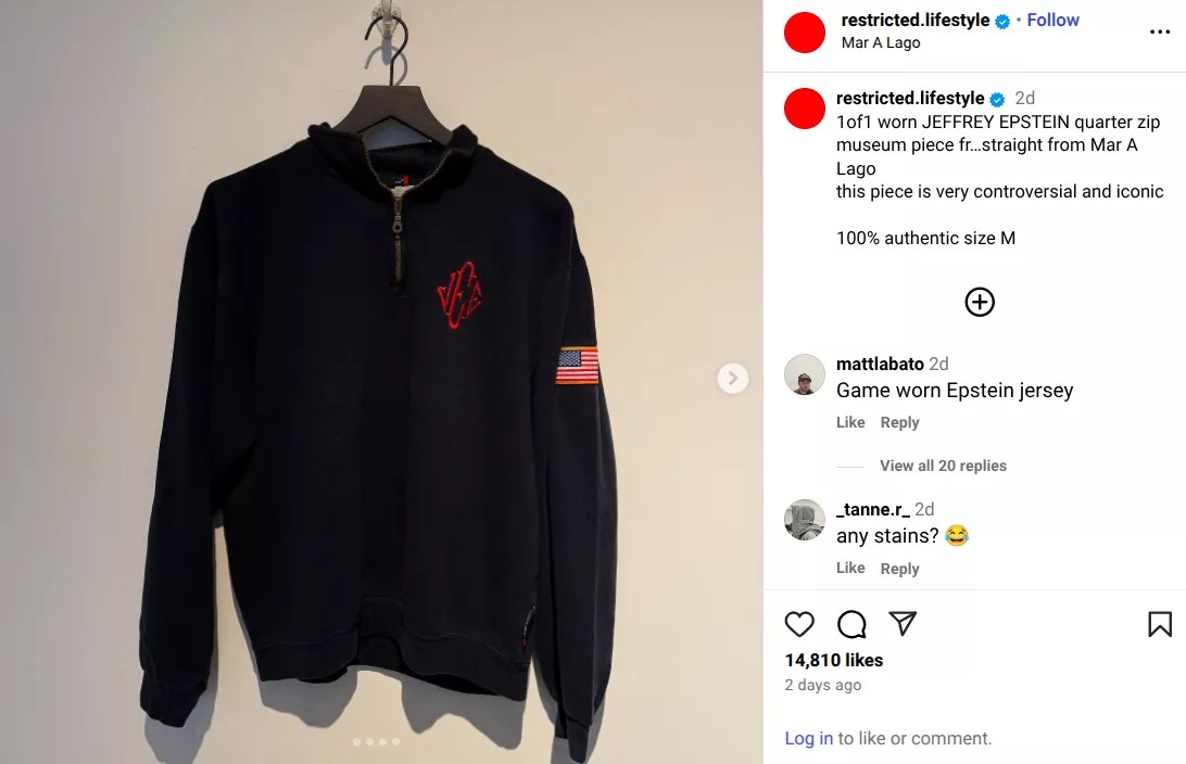 “1of1 worn JEFFREY EPSTEIN quarter zip museum piece fr…straight from Mar A Lago,” the post reads. “This piece is very controversial and iconic. 100 percent authentic size M.”
