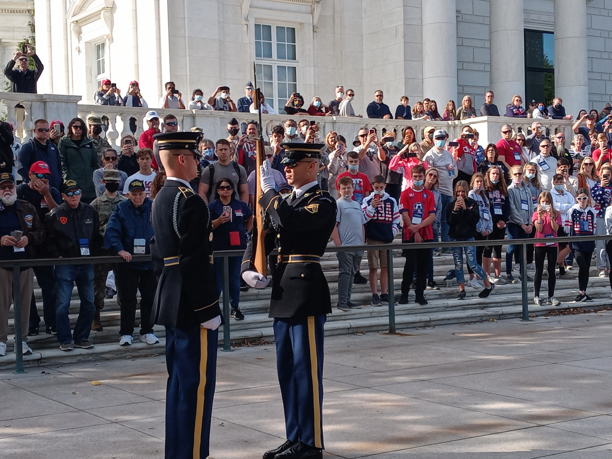 A breeze blows autumn leaves onto the pavement as a guard commander in sterling black uniform emerges from behind the Arlington Memorial Amphitheater to relieve the current guard, a thin young man in identical uniform, black sunglasses on his shaved head, and a brown rifle slung across his shoulder. Another young man with a rifle follows behind the commander, and the veterans watch in reverence and familiarity as the superior inspects his subordinate’s firearm for marks with pristine white gloves. Satisfied, he instructs the retiring sentinel to repeat his orders to the new sentinel, who then begins his shift by marching 21 steps in each direction in front of the tomb – a reference to the 21-gun salute bestowed upon fallen soldiers.