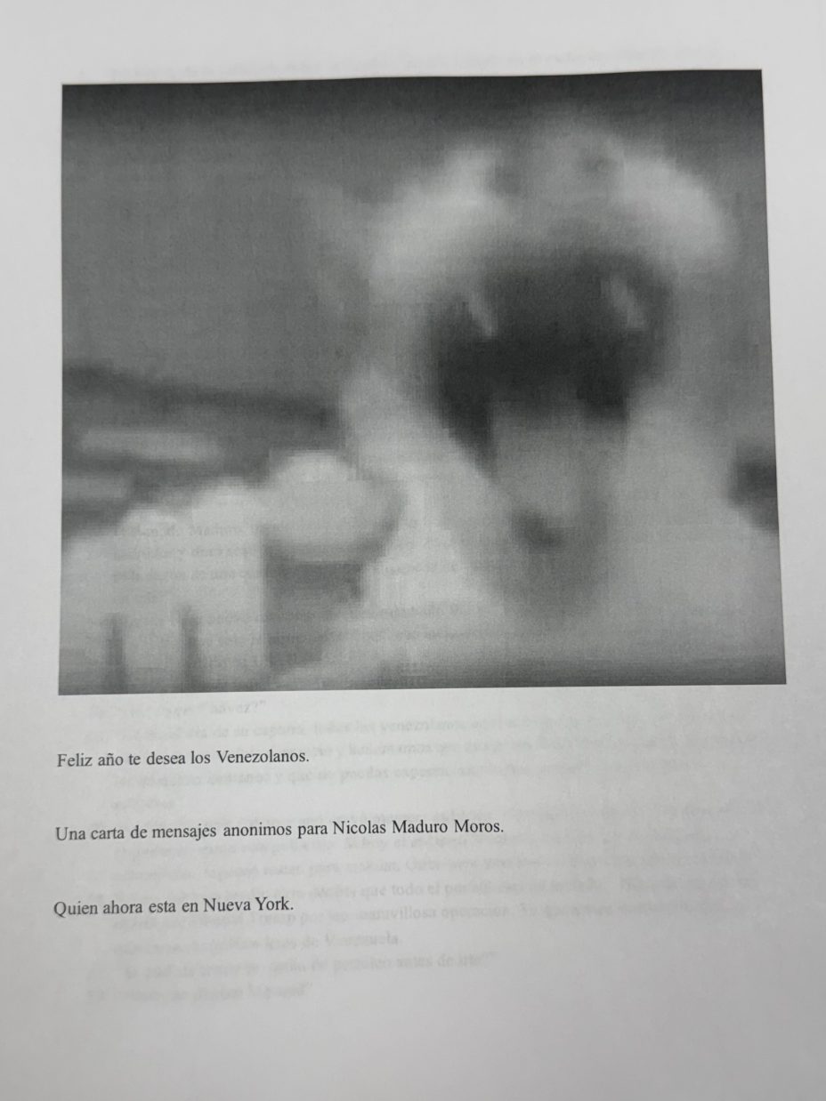 The first page of the letter features a meme of a cat pointing and laughing alongside the words: Feliz año te desea los Venezolanos. Una carta de mensajes anónimos para Nicolás Maduro Moros, quien ahora está en Nueva York.” (Happy New Year from the Venezuelans. A letter of anonymous messages for Nicolás Maduro Moros, who is now in New York.)