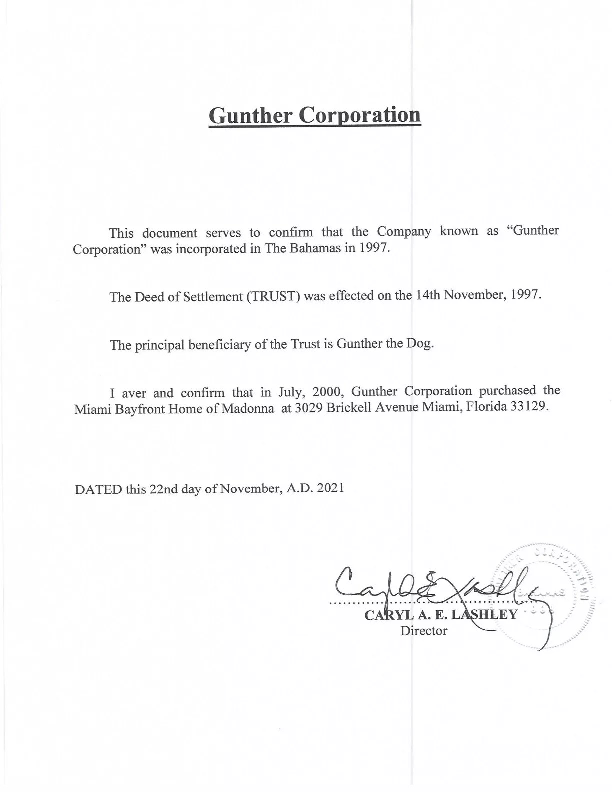 A document purports to show that Gunther the Dog is the “principal beneficiary” of the Gunther Corporation trust.