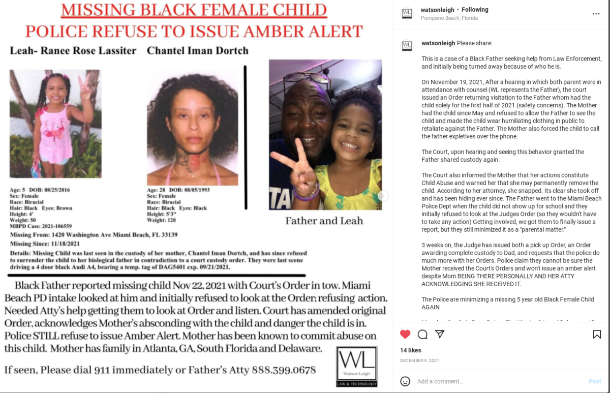 Despite Lassiter’s repeated attempts, Miami Beach police refused to release an Amber Alert for the missing Black girl – because, Lassiter says, they determined the issue was a civil/family matter between him and Dortch (i.e., not police business) and declined to look at the court order documenting Lassiter’s legal custody. When Lassiter said he wanted police to perform a welfare check on Leah-Ranee, Lassiter says, the officer told him, “And I want to win the lottery.”