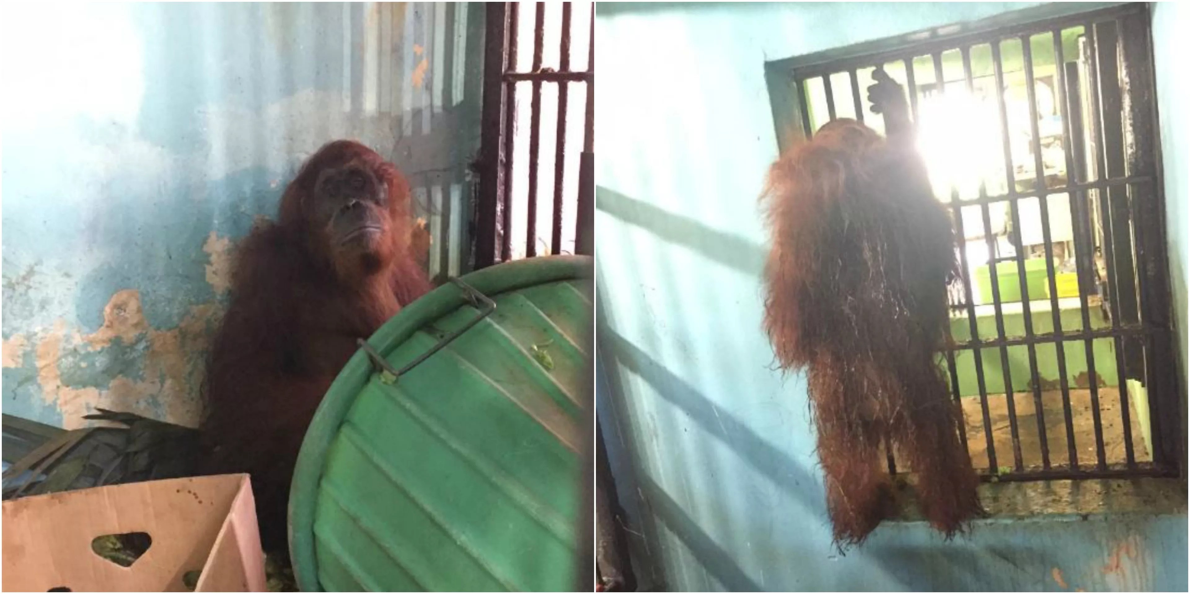 Justice4monkeys also shared a collection of pictures of Mei, the park’s orangutan, in an enclosure with feces-streaked walls. Cardboard boxes and rotten fruit litter the floor in a “nest” beneath an overturned plastic bucket.