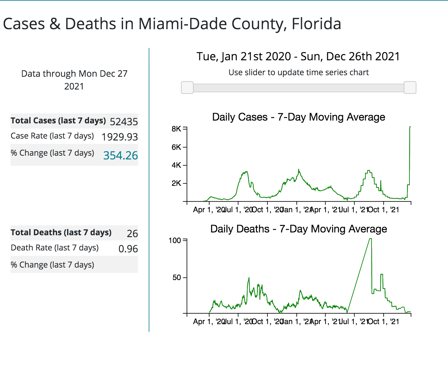 Since mid-November, the county’s seven-day positivity rate soared from 1 percent to a whopping 24 percent. According to Miami-Dade’s most recent COVID-19 Dashboard Report, of the 1,316 COVID-19 patients admitted to local hospitals between December 16 and December 27, 873 (66 percent) were unvaccinated, 370 (28 percent) were vaccinated, and 73 (5 percent) were vaccinated with a booster. Twenty-six people are reported to have died from COVID-19 between December 20 and December 26 in the county.
