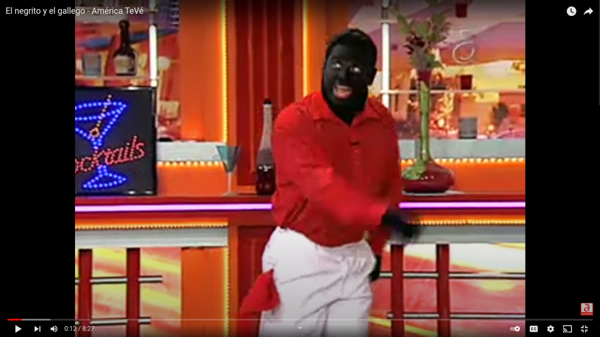 A clip from Carlucho’s erstwhile comedy series El Negrito y El Gallego, in which he portrayed a white Spaniard (El Gallego) opposite a fellow white Cuban actor in blackface as El Negrito.