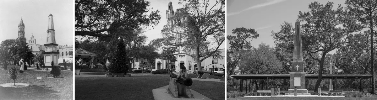 St. Augustine’s Confederate War Memorial was an obelisk commissioned by the Ladies’ Memorial Association and erected in 1872. In June 2020, St. Augustine city commissioners voted 3-2 in favor of moving the Confederate monument from the Plaza de la Constitucion downtown. The square has since been resodded, with only nearby cannons remaining. In September, the 10-ton monument was lifted onto a flatbed truck, loaded onto a barge, and floated down the St. John’s River to Trout Creek Fish Camp. That private property is where it’s been reinstalled, at the same site as the monument to Confederate Maj. Gen. William Loring.