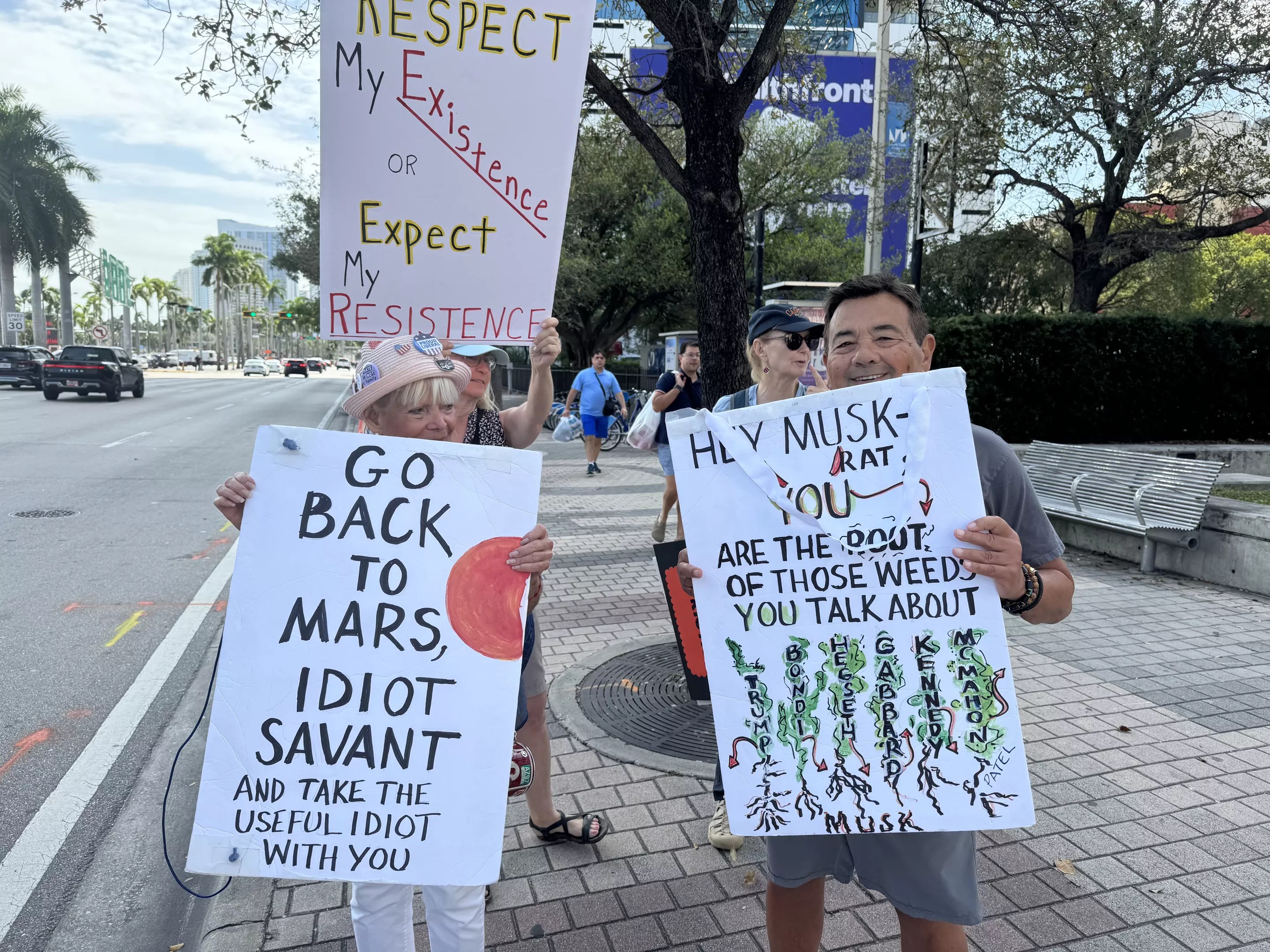 Protesters gathered in downtown Miami on Monday to protest President Donald Trump’s recent slate of executive orders and tech billionaire Elon Musk’s prominent role in the federal government.