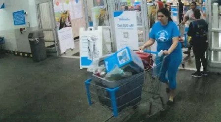 Lubby Navarro leaves Walmart in December 2022 with a shopping cart filled with items, including a Cheesecake Factory gift card, chocolates, Chanukah menorah, and fresh flowers.