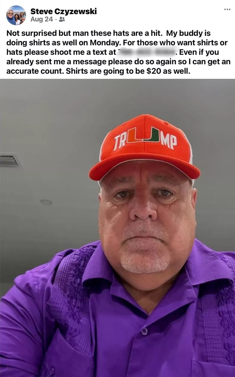 In a series of Facebook posts, Czyzewski posted selfies modeling the Trump hats and T-shirts, saying a friend was offering them for sale at $20 a pop.