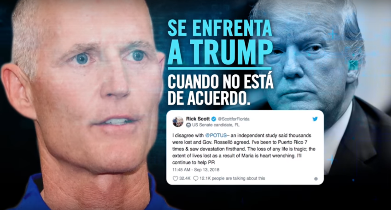 The ad asserts that Scott has been a great friend of Puerto Rico by pointing out that he has visited the island eight times and that Florida offered aid and tuition breaks to those living on the island and those who moved to the Sunshine State. “Scott confronts President Trump when he disagrees,” a woman’s voice intones. “Bill Nelson is weak.”