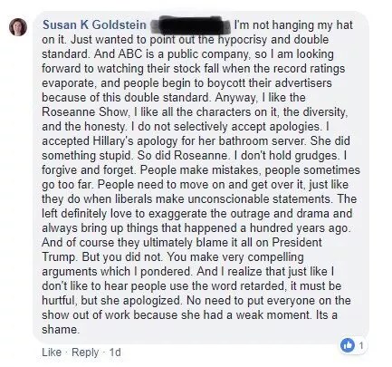 I like the Roseanne show. I am not a racist. Just think there is a double standard. Thanks FB friends for the very civil and enlightening discussions and opinions from both sides. Especially my friends… and others whose historical citings helped me to better understand the other side. I appreciate the opportunity to have honest discussions and spirited debate when it comes to such divisive issues.