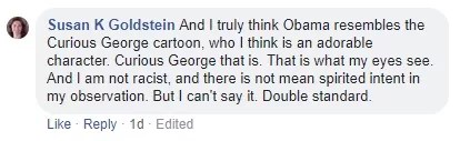 “And I truly think Obama resembles the Curious George cartoon, who I think is an adorable character,” Goldstein wrote on Facebook. “Curious George that is. That is what my eyes see. And I am not racist, and there is not mean-spirited intent in my observation. But I can’t say it. Double standard.”