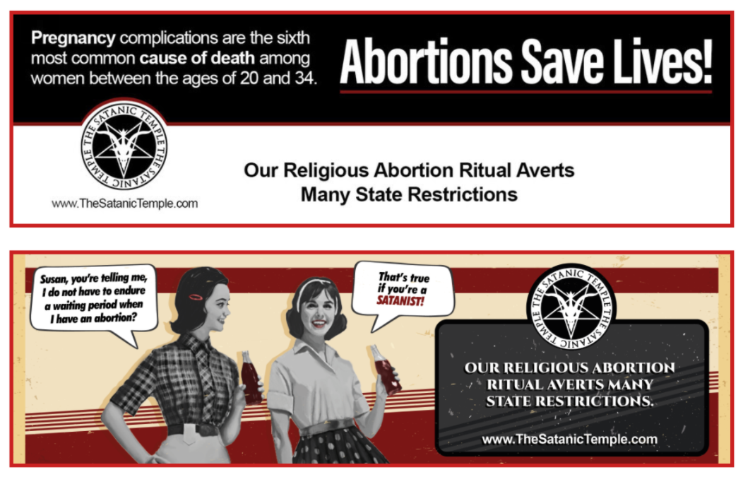The Satanic Temple of Salem in Massachusetts bought the billboard space in North Miami Beach, visible from the northbound lane of Interstate 95, to display a quirky new ad about the temple’s “religious abortion ritual,” which allows members of the religious organization to circumvent state restrictions on abortions. In Florida, anyone seeking to terminate a pregnancy is required to have an ultrasound and go through pre-procedure counseling, but the Satanists believe a religious exemption can be cited to get around that.