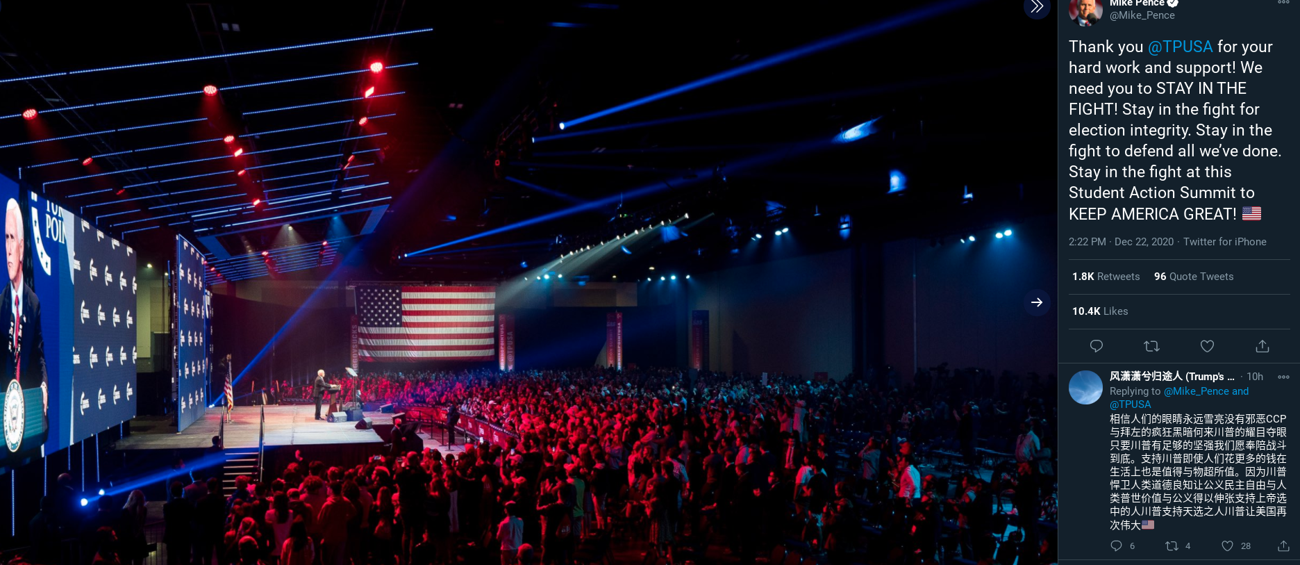 Mike Pence courageously defends Trump’s honor. On the final day of the conference, Vice President Mike Pence encouraged the students to “stay in the fight” for the presidential election.