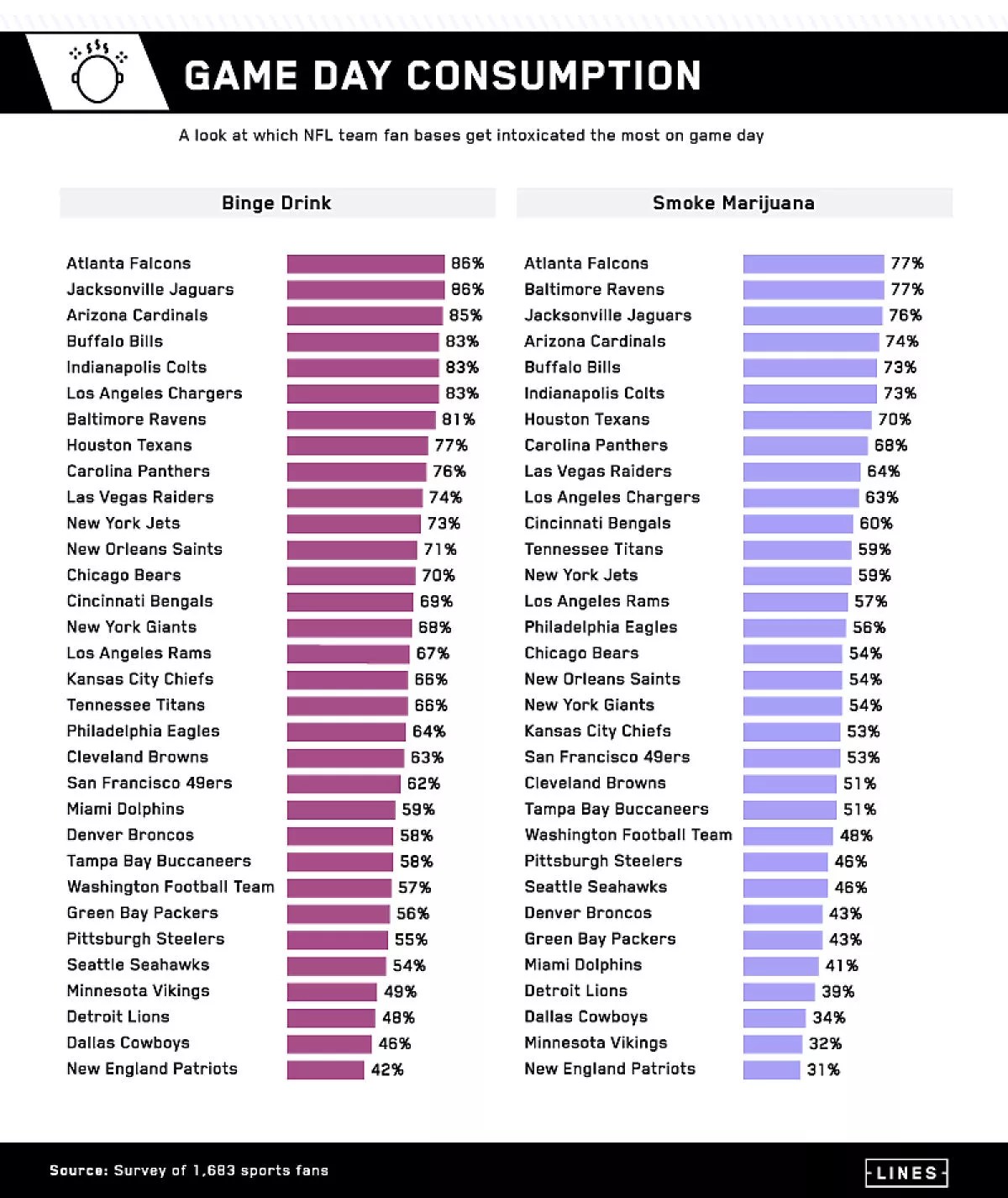 The survey found there was a clear winner in the “sports fans most likely to get lit” department: fans of the 4-12 Atlanta Falcons. Falcons fans topped the list, with 86 percent admitting to binge-drinking and 77 percent reporting smoking marijuana while watching games. Clearly, they’re still not over their team blowing a 28-3 lead over the New England Patriots in 2017’s Super Bowl LI. Who can blame them, really?