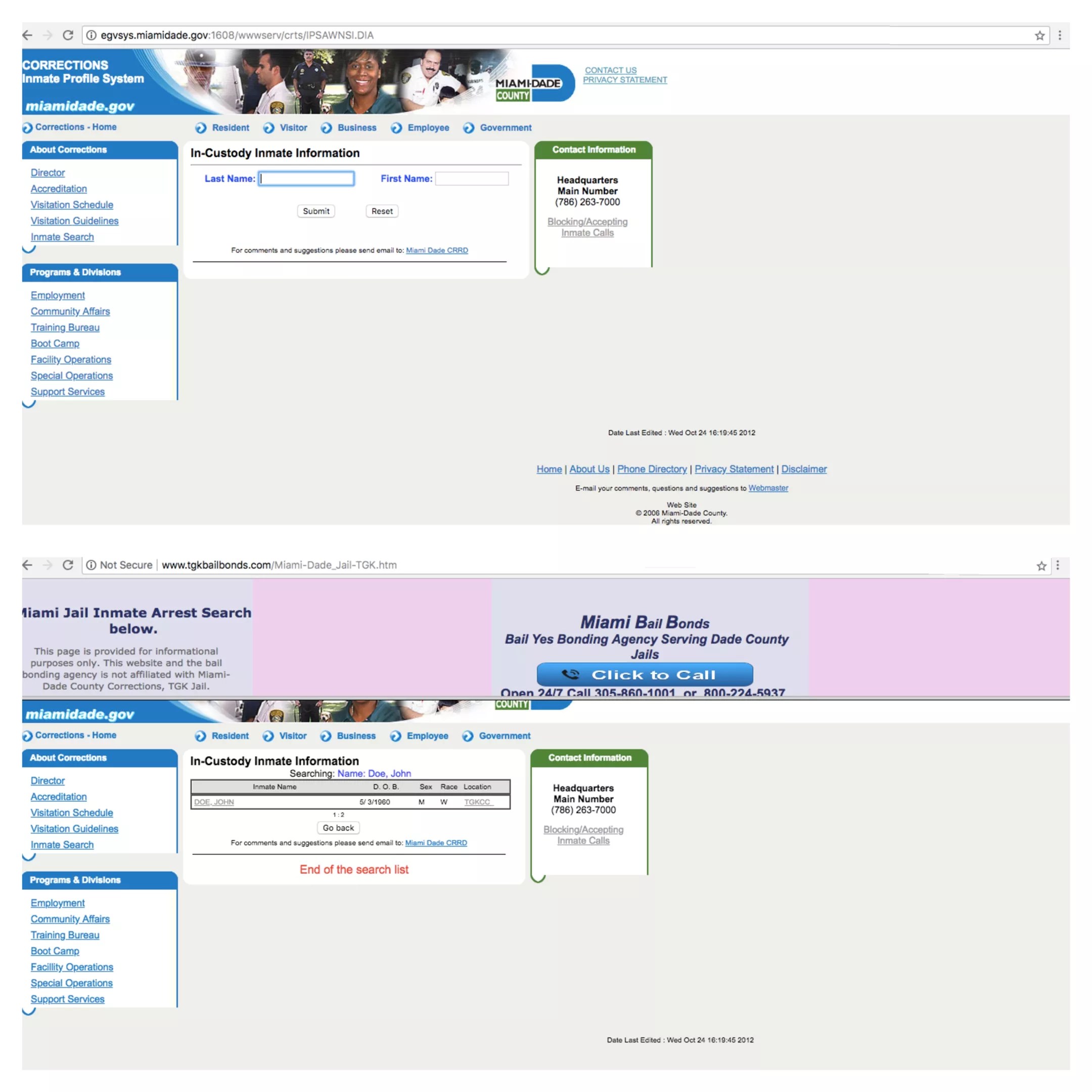 A bail bonds agent named Vanessa answered the call for the second number listed on the TGK Bail Bonds website. She repeatedly insisted their website looks nothing like the MDCR inmate search page and said she would pass the message on to the owner. Asked further about TGK Bail Bonds’ site’s resemblance to the government inmate search page, Vanessa said, “Every bail bonds office does that. I don’t know why you have such a hard-on for it.”