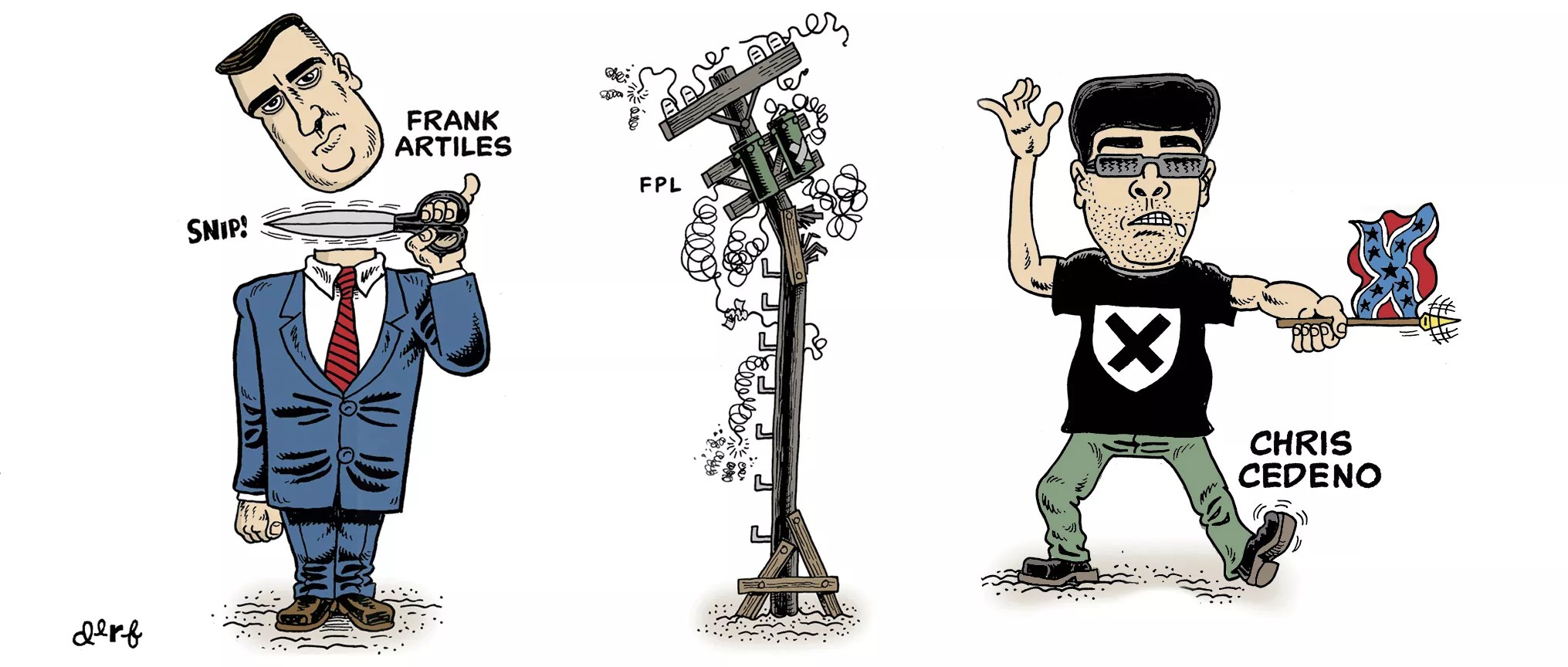 Frank Artiles. After Donald Trump was elected president of the United States despite his proclamation of love for grabbing nonconsenting women “by the pussy,” it seemed Republicans could say anything without suffering a penalty. But then came Florida Sen. Frank Artiles, who muttered, “Hold my cerveza, bro.” Artiles was already well known for trying to ban doctors from discussing guns with patients, sponsoring a (failed) Florida version of North Carolina’s transphobic bathroom bill, and deriding Muslims as “hajis.” Artiles, a GOP mainstay from West Kendall, had long been a malignant force in Tallahassee. The hard-right loon was also accused of punching a college kid in the face at a bar, got caught lying about living in his district, and accepted an all-expenses-paid vacation from Florida Power & Light before writing pro-energy-monopoly bills. But in April, he made even Florida Republicans shun him by dropping the N-bomb in front of a black legislator. He refused to resign and might have survived that racist misadventure if the Miami Herald hadn’t quickly revealed he’d hired a former Playboy model and a Hooters waitress as “political consultants.” Don’t sweat it, Frank – with that resumé, you’re a shoo-in for a gig in the Trump administration.