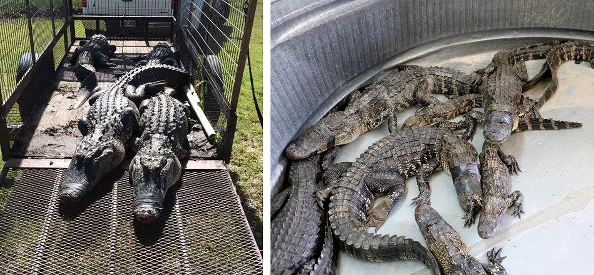 After exchanging hellos, the boys lowered the tailgate and lifted a silver tarp to reveal their hidden cargo: 16 live alligators.