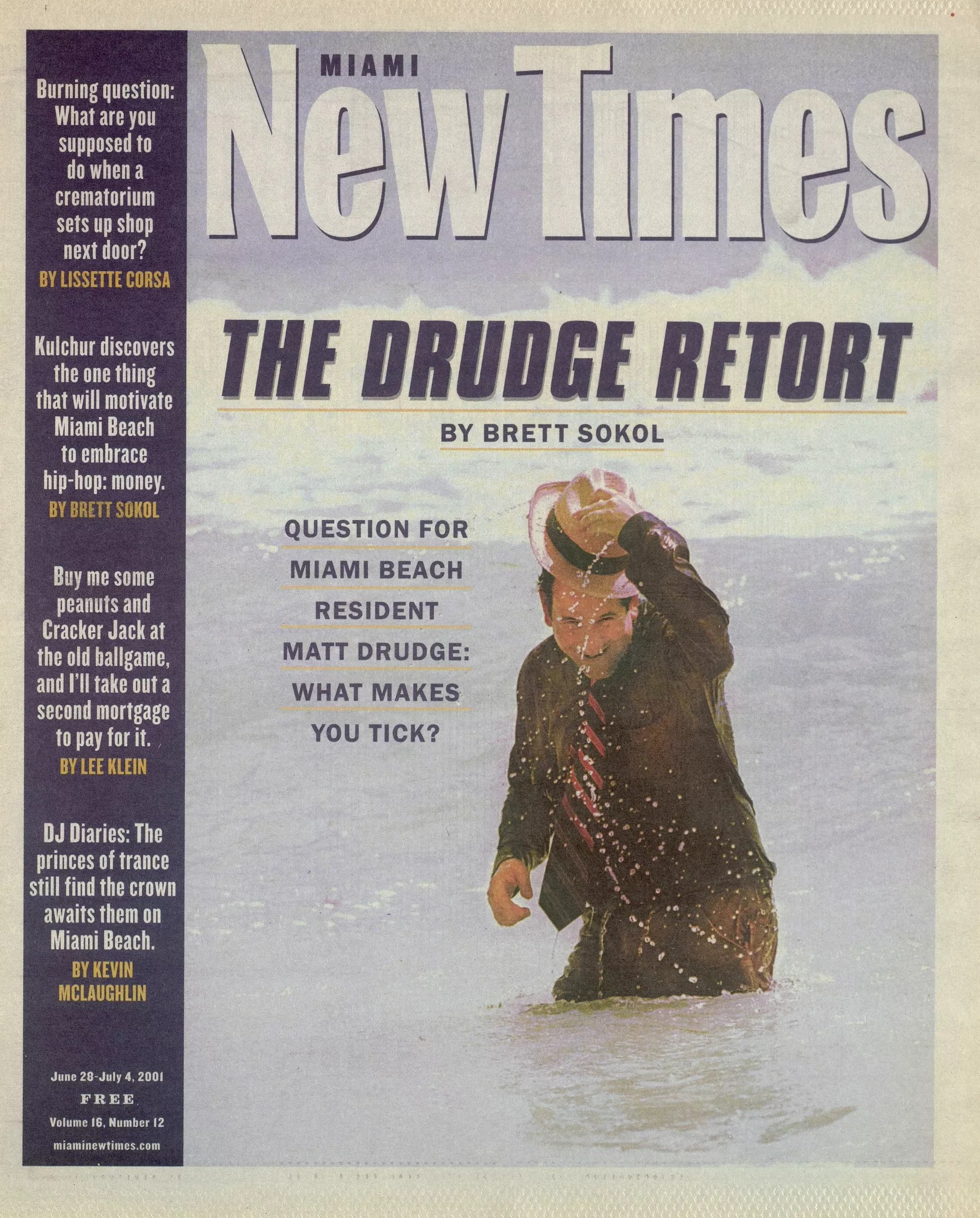 Besides, the lawsuit was settled in May, with Blumenthal not only dropping matters completely but actually cutting Drudge’s lawyer a check for $2500 to cover some travel expenses. Though he crowed to the New York Times that the publicity from the lawsuit had rocketed him “from rags to riches – and I got to keep them,” his mood today isn’t one of vindication. “They went out of their way to cover this lawsuit really aggressively, but it didn’t come down the way they wanted it to,” he says, pointing to the relative silence from major media outlets following the settlement’s announcement. “There was nine seconds from Judy Woodruff on CNN after probably a couple of hours discussion on the lawsuit.” Screenshot of the cover of the June 28-July 4, 2001, issue of New Times, which featured “The Drudge Retort,” a longform feature story by staff writer Brett Sokol Miami New Times image (photo by Jennie Zeiner)