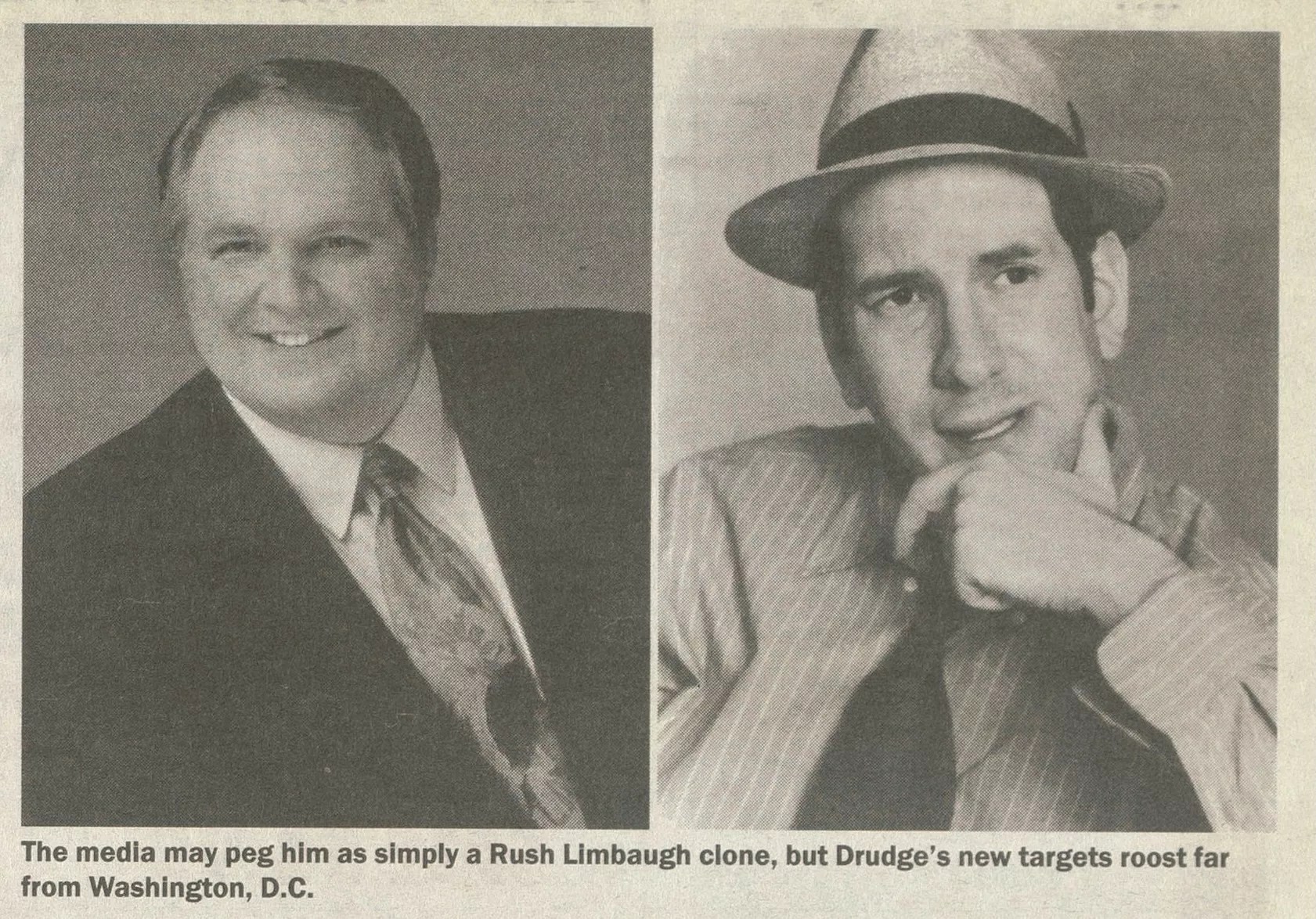 “Look, I know what journalists think of me: that I’m an uneducated fool who was working in a gift shop and hit it big. And there’s nothing they can do about that. I get e-mails all the time: “Help me, I’m sixteen years old. I don’t want to go college; I want to be like you.'” Screenshot of paired photos of Rush Limbaugh and Matt Drudge as they appeared in the June 28-July 4, 2001, issue of New Times Miami New Times image