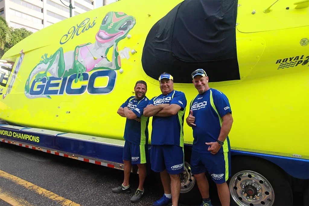 Fishhead says the Miss Geico team is usually careful about surroundings. “But we are the biggest, baddest racers in the world,” he adds. (The Miss Geico crew mates are ten-time world champions.) “We are rock stars.”