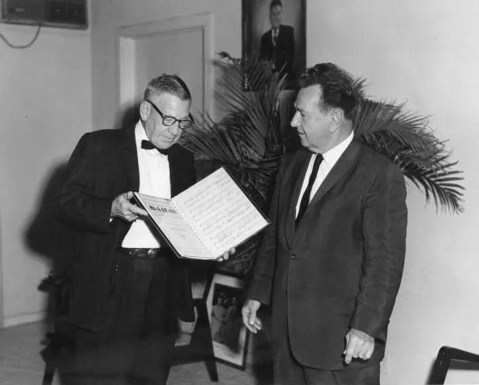 Hialeah Mayor Henry Milander (right) with Harry Ewing, musician and author of the hymn of Hialeah, in 1963