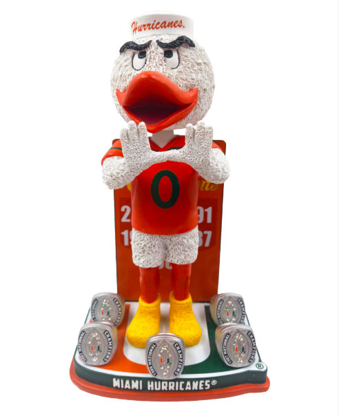 The bobblehead depicts Sebastian the Ibis with UM’s five championship rings.