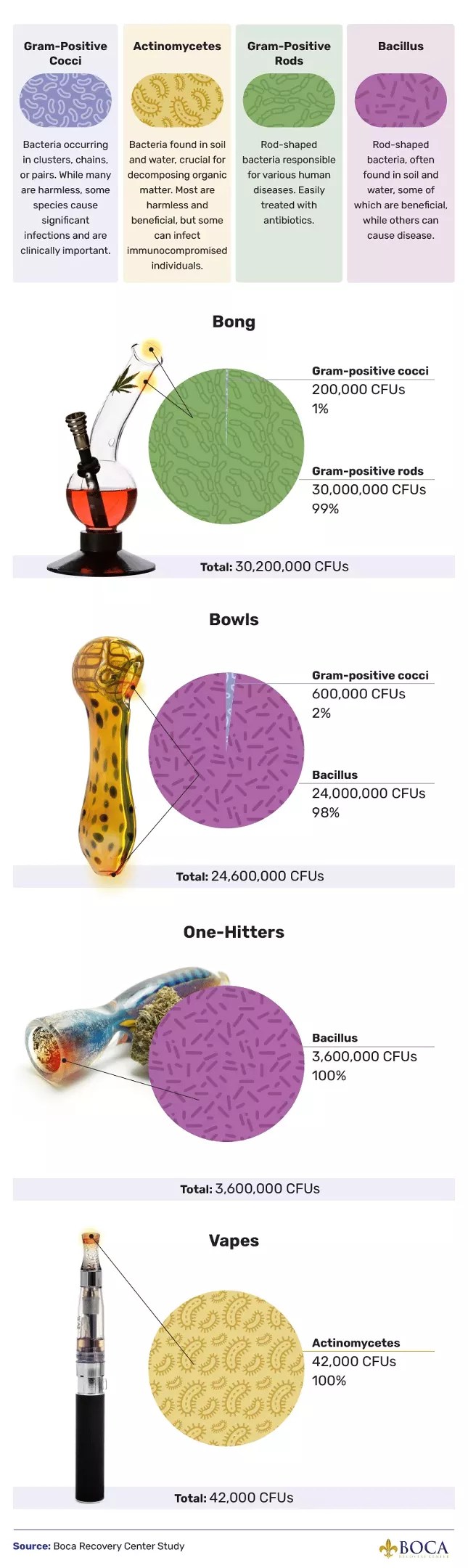 The study found a wide range of bacteria hanging out on your pot (or tobacco) paraphernalia. Researchers analyzed the bacterial content of bongs, bowls, vapes, and one-hitters using colony-forming units (CFUs) – a fancy term for the number of viable bacteria cells in a sample. Here’s what they found: