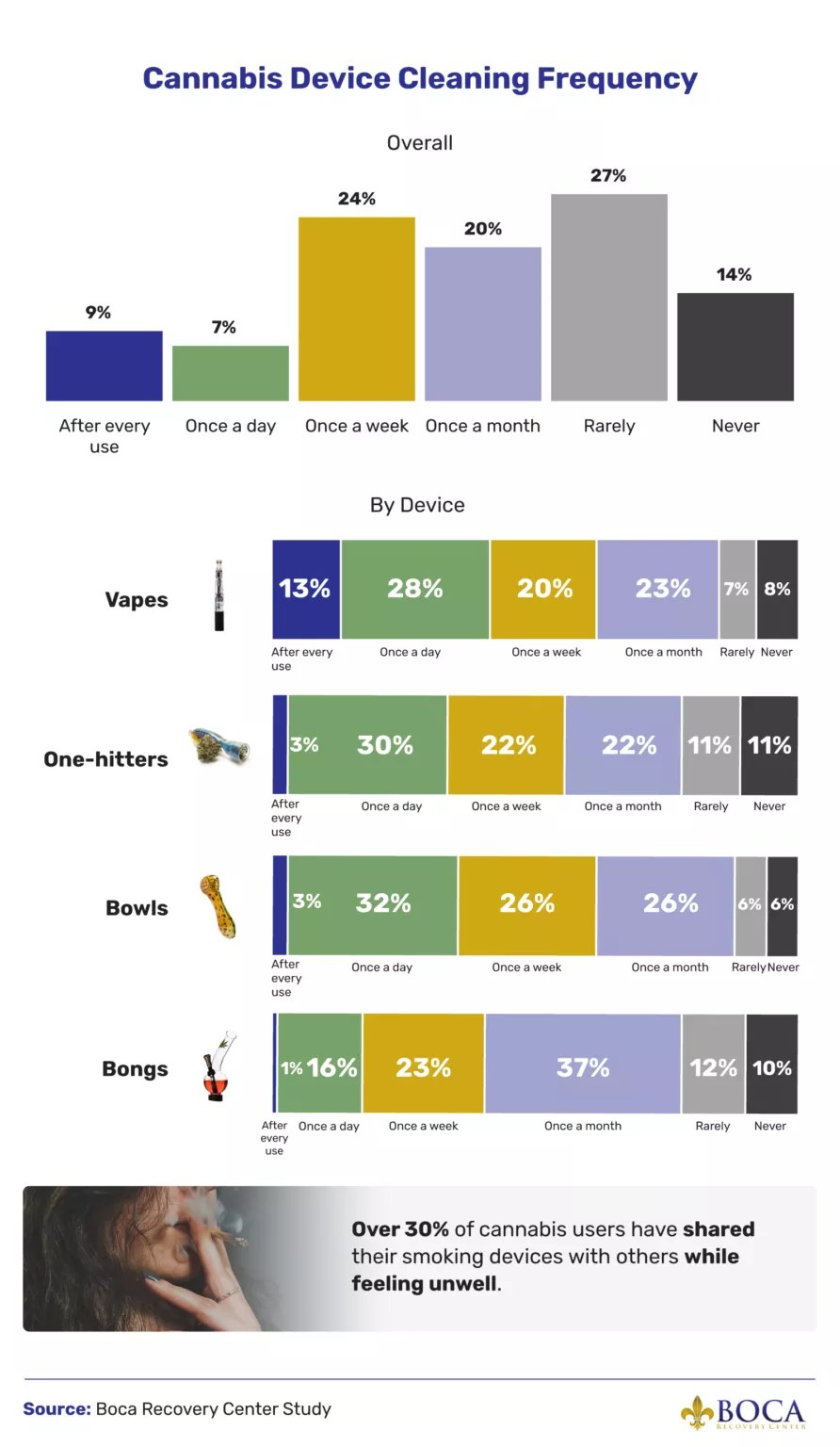 “It’s alarming and disturbing that more than one in ten cannabis users have never cleaned their devices,” Tarlow says. “Inadequate and infrequent cleaning of paraphernalia can result in harmful bacterial buildup.”