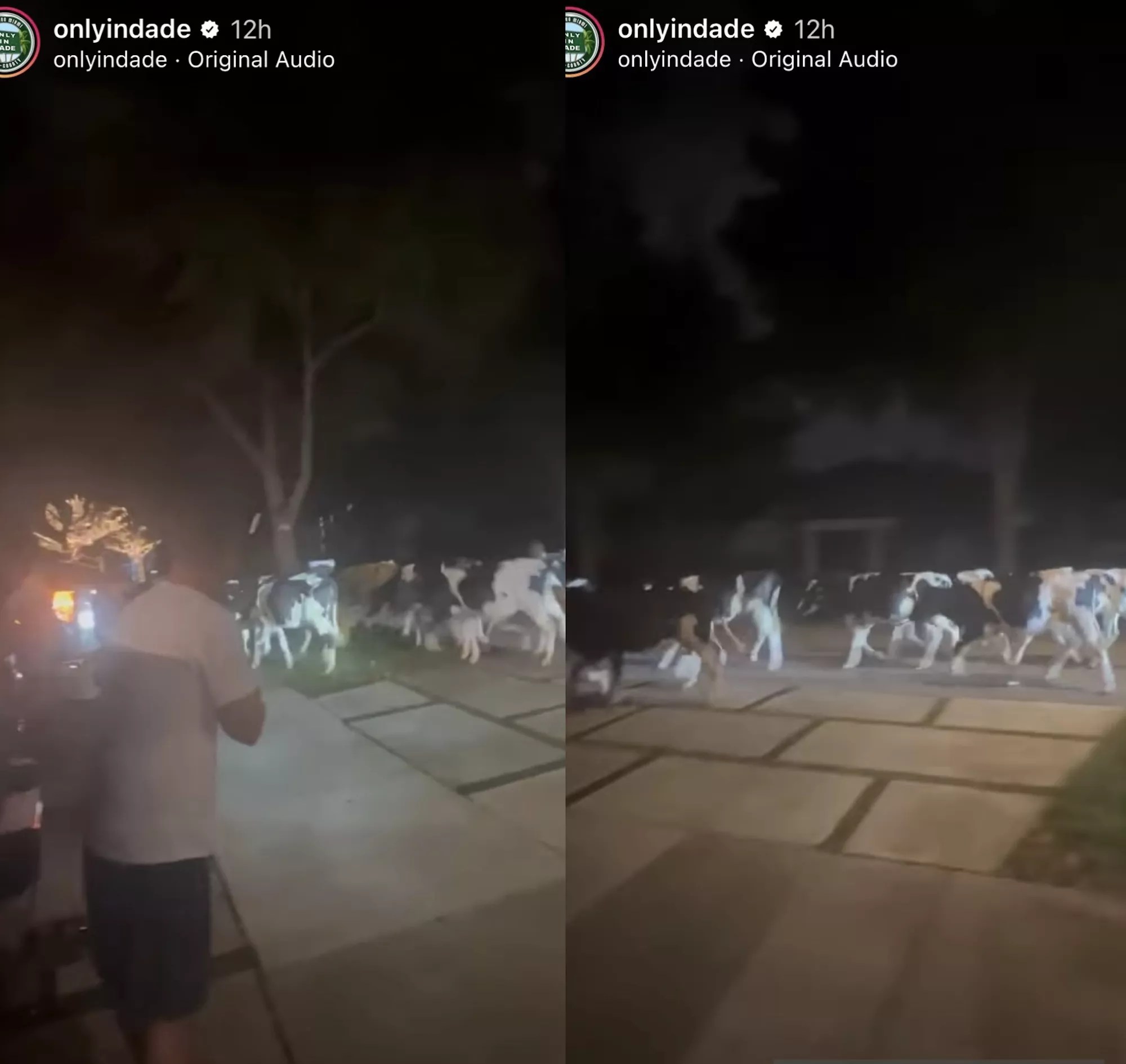 In a separate video posted by the neighbor, several cows are seen standing in a front yard, munching on what appears to be a bush under the glare of patrol car headlights. Two uniformed officers stand by, seemingly bewildered.
