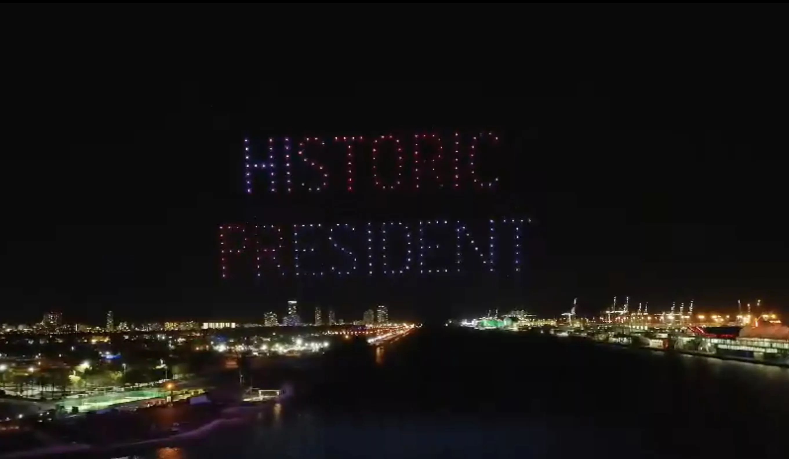 “Historic president,” the drone show illuminated over Biscayne Bay.