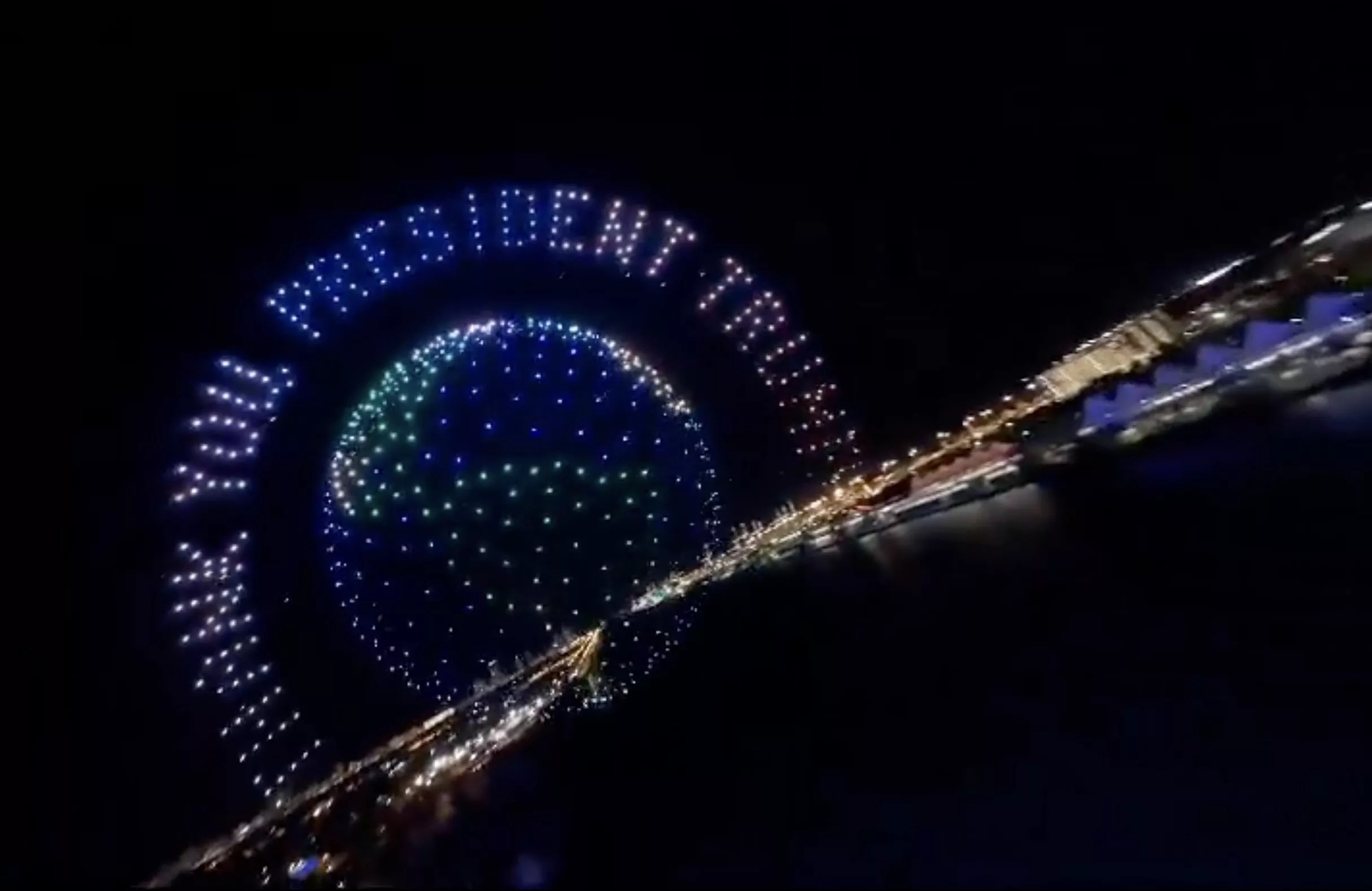 We kind of had to squint: PTZtv’s archive consists of snapshots taken once per minute as the camera pans across the bay and the port. But at the 9:32 mark, we caught our first glimpse of the illuminated drones. The image was indistinct, as were subsequent snapshots from 9:34 and 9:35. Stills from 9:37 and 9:38 p.m. absolutely captured the bald eagle formation. And 9:42 the camera caught the drones forming the globe that preceded the “THANK YOU, PRESIDENT TRUMP” sign-off seen on the splash reel.