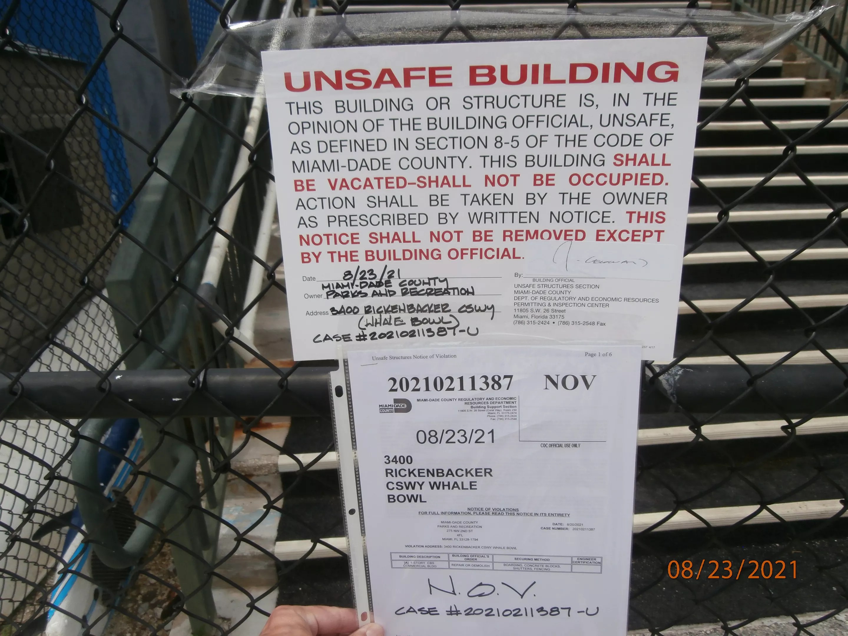 Miami-Dade County inspectors posted an unsafe-building notice at Miami Seaquarium’s Whale Bowl stadium in 2021.