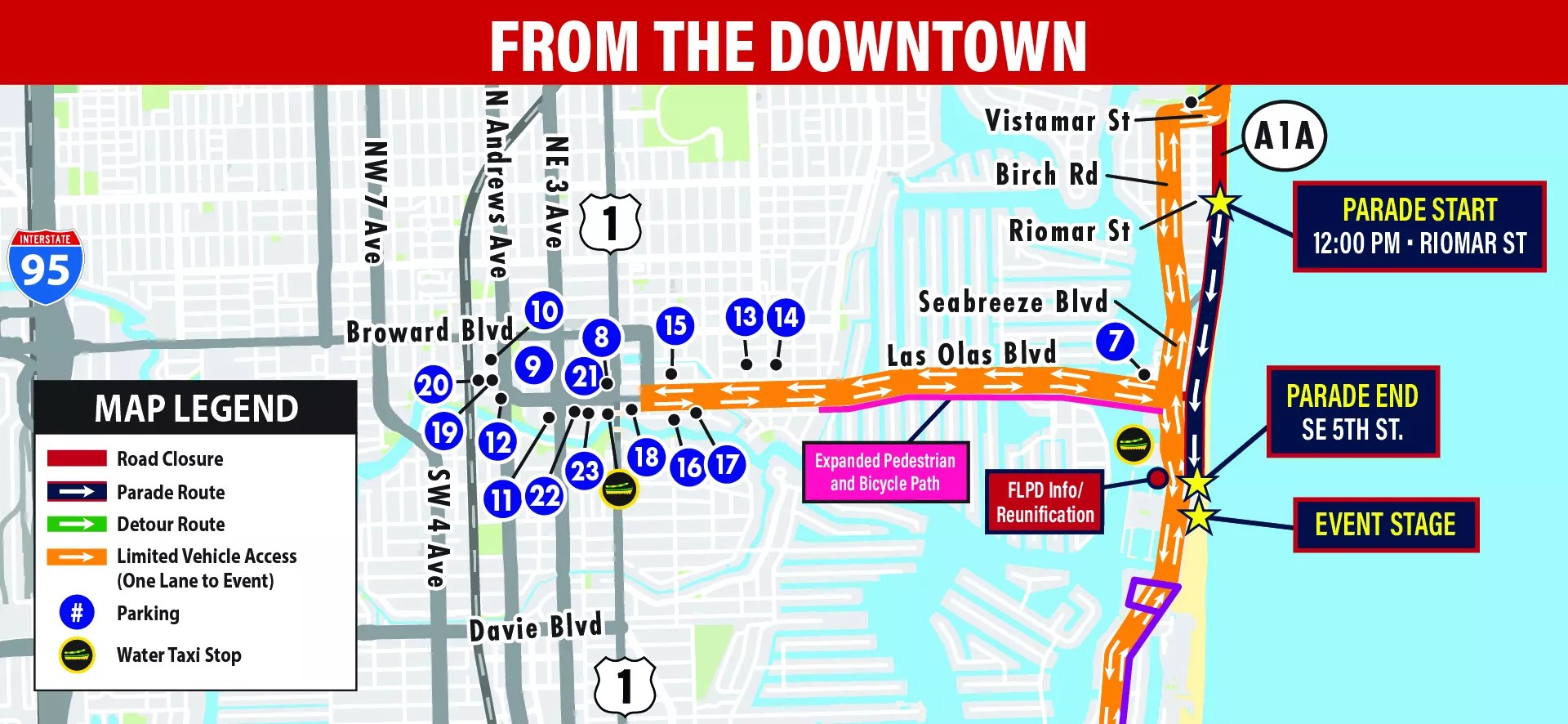 The city advises downtown visitors to expect limited parking and long walks to the event site. To get closer, officials recommend using the water taxi or ride-share services. Broward County Transit will offer continuous loop service to the event site from 8 a.m. to noon, and then back to parking facilities between 2 and 4:30 p.m.